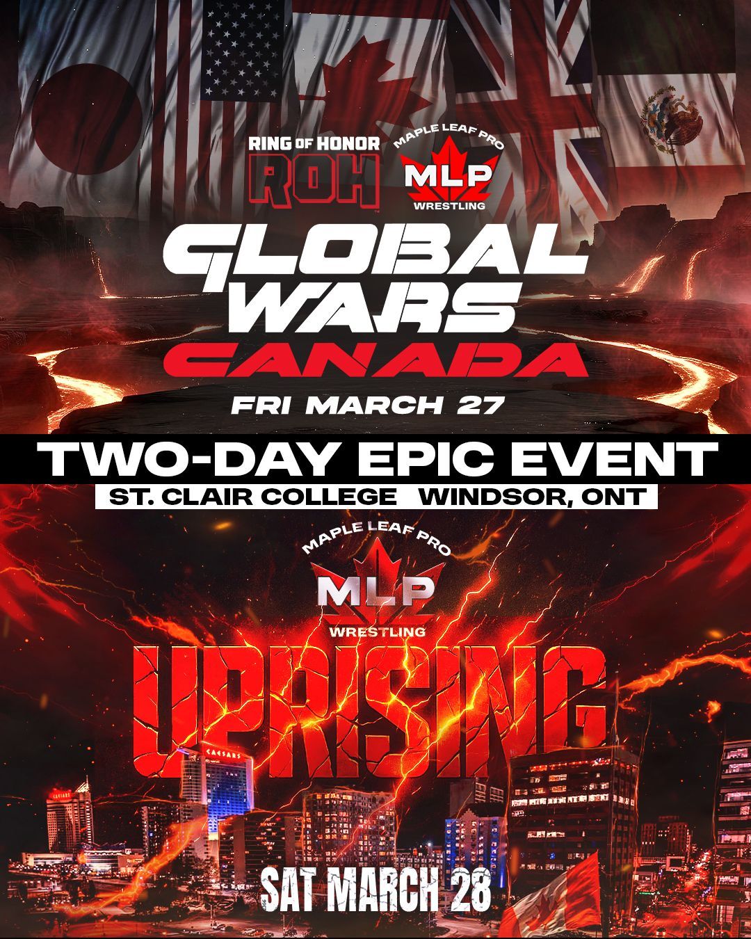 "We are thrilled to partner Ring of Honor with MAPLE LEAF PRO Wrestling for GLOBAL WARS and MLP UPRISING on March 27 and 28," said AEW CEO Tony Khan. "Both events will spotlight incredible stars from around the world and deliver amazing wrestling action to fans over the course of two exciting nights."