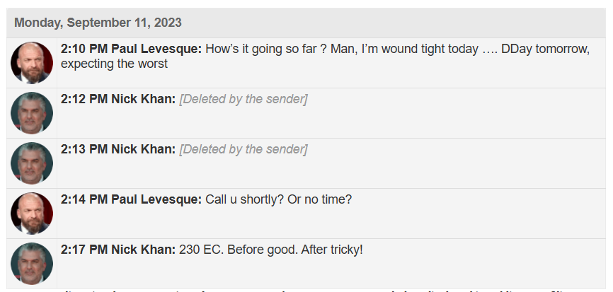 Two months later, on a Saturday night, December 9, 2023, Levesque texted Khan.