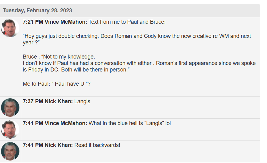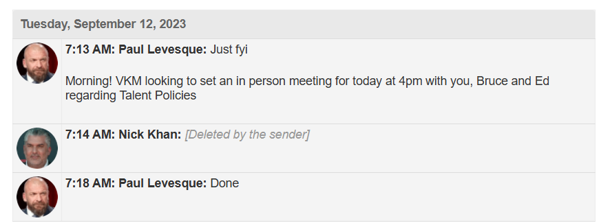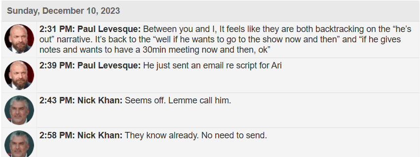 A few minutes later, Triple H told Khan that Vince McMahon had called for a meeting later that day with “Bruce and Ed,” possibly referring to senior creative team members Bruce Prichard and Ed Koskey.