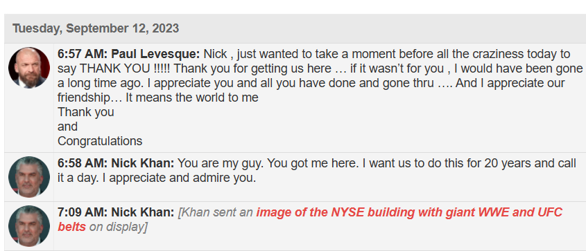Text messages between WWE's Chief Content Officer and President Nick Khan, disclosed in Delaware Court of Chancery filings, reveal tension within WWE's executive ranks in September 2023.