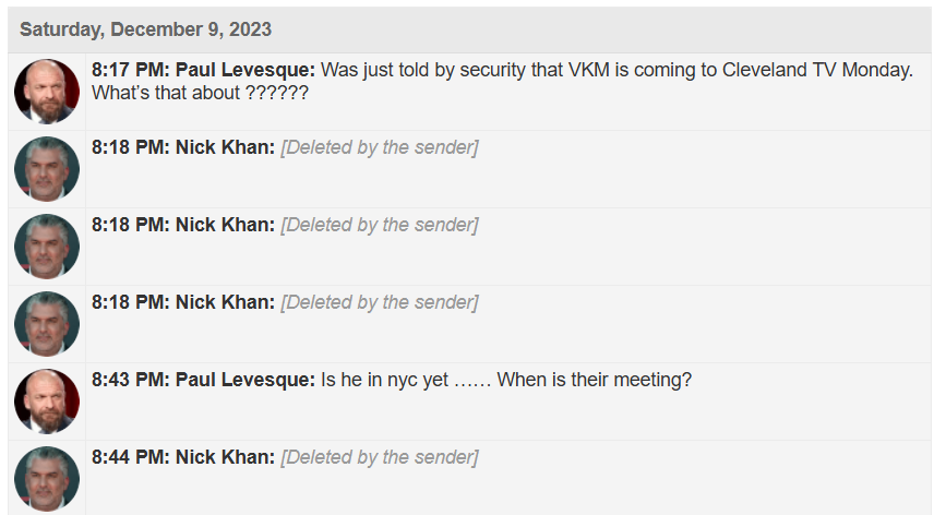 The public filings don’t show further messages between Levesque and Khan for the next few hours. It is reported that any calls or messages that might have happened in that window, whether Khan reached Emanuel, McMahon, or both, aren’t reflected in the record.