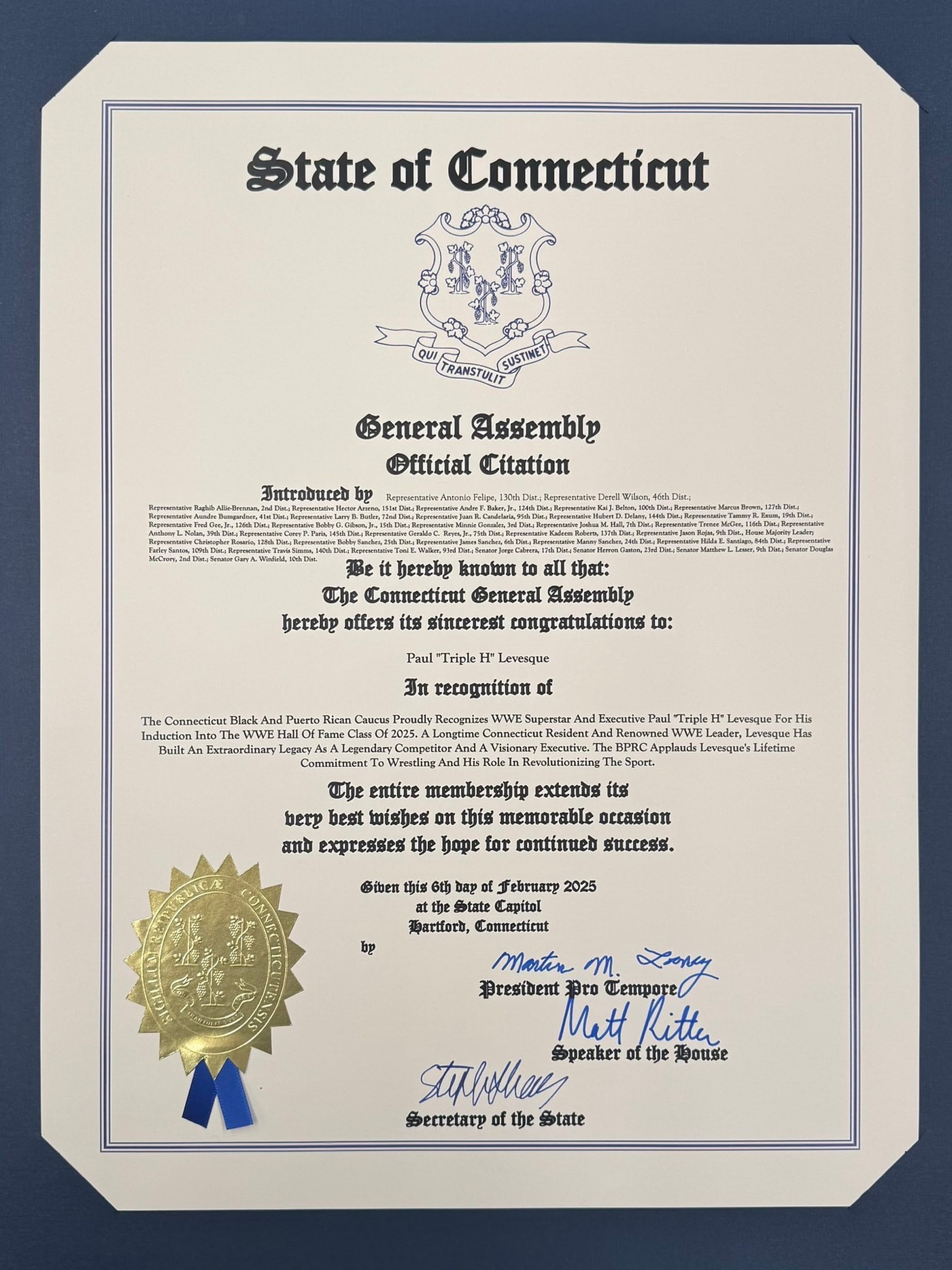 The official citation, signed by the President Pro Tempore, Speaker of the House, and Secretary of State, was presented at the State Capitol in Hartford. It was introduced by a bipartisan group of representatives and recognizes Levesque's induction into the WWE Hall of Fame Class of 2025. The document acknowledges his dual impact as both a performer and executive, highlighting his ongoing influence in the professional wrestling industry.????????????????