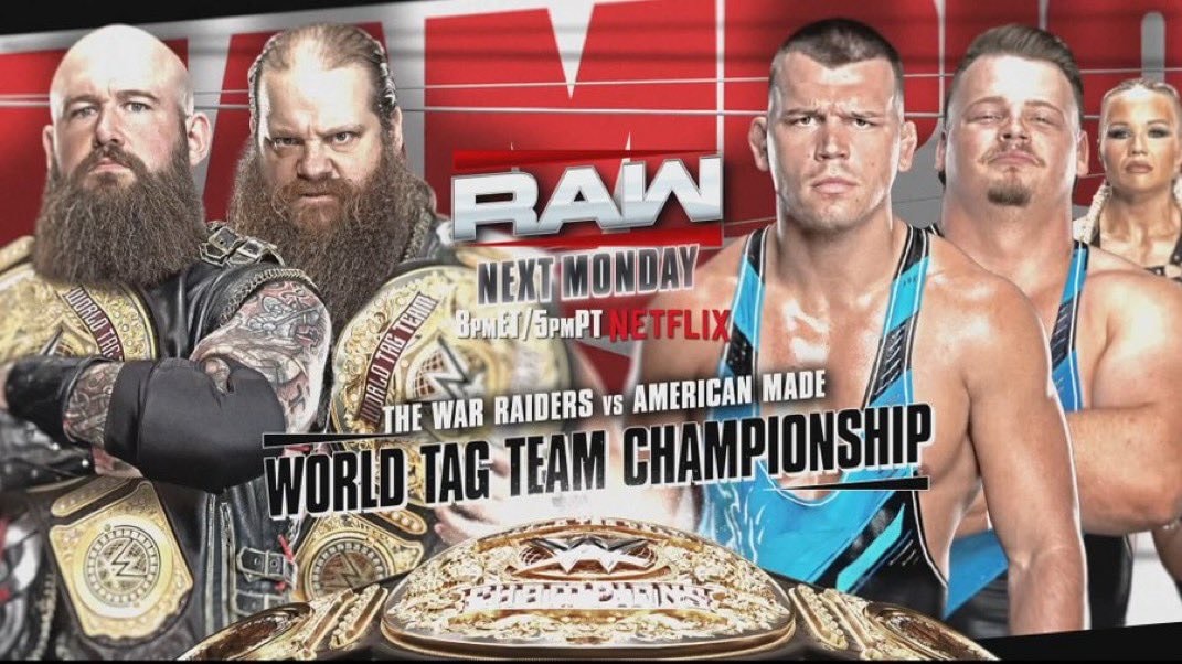WWE World Tag Team Championships: The War Raiders (Erik & Ivar) will put their titles on the line against The Creed Brothers (Brutus & Julius Creed). This rematch follows their previous encounter where The Creed Brothers attacked the champions with the title, causing a disqualification.