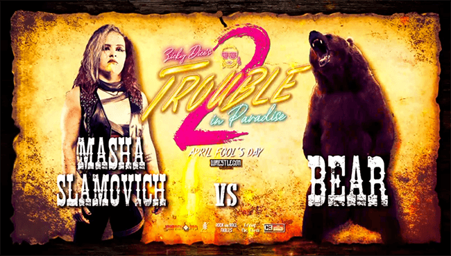The second edition of Zicky Dice’s Trouble In Paradise saw Rich Swann go head to head with Scotty 2 Hotty in the main event. Zicky Dice’s Trouble In Paradise 2 also featured a Sensational Sextuplet Scramble match which featured Frontman Jah-C, Keita Murray, Carlie Bravo, Levi Shapiro, Darian Bengston, and Lord Crewe. Masha Slamovich also faced a bear (Max The Impaler).