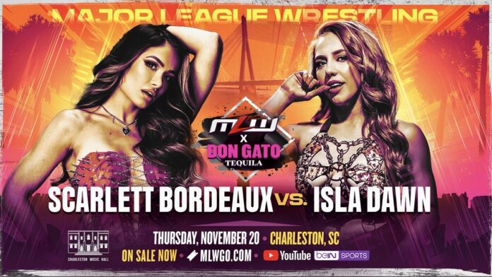 Major League Wrestling has announced a high-profile women’s match for its MLW x Don Gato Tequila Live Special on Thursday, November 20 at the Charleston Music Hall. Scarlett Bordeaux will face Isla Dawn in what marks both a historic return and a significant debut.