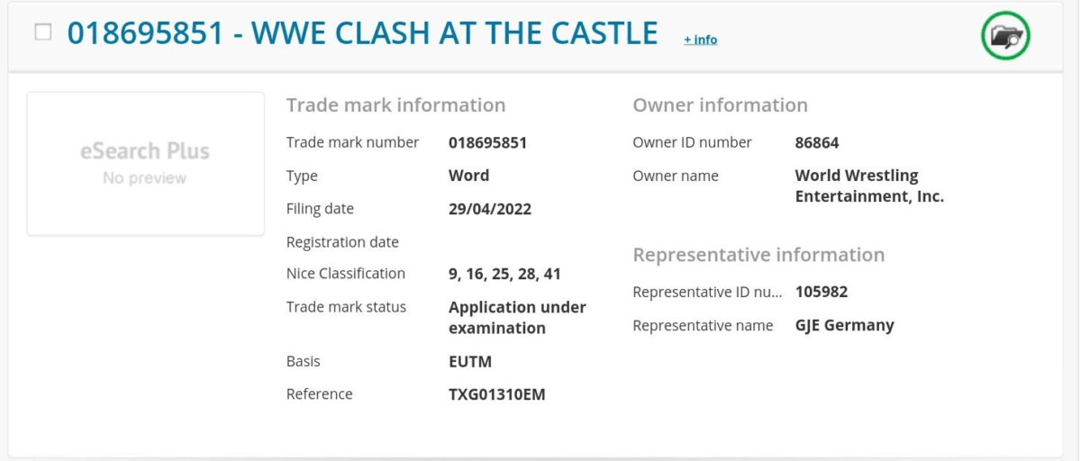 WWE has filed a new trademark for "Clash at the Castle." The filing has surfaced on the European Union Intellectual Property Office website.