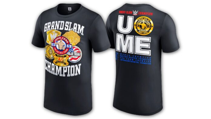 The new commemorative Grand Slam Champion t-shirt is now available at WWE Shop, featuring Cena’s complete championship history on the back. The black shirt celebrates his 13 WWE Championships, 4 World Heavyweight Championships, 5 United States Championships, 4 Tag Team Championships (with partners Shawn Michaels, Batista, The Miz, and David Otunga), and now the Intercontinental Championship.
